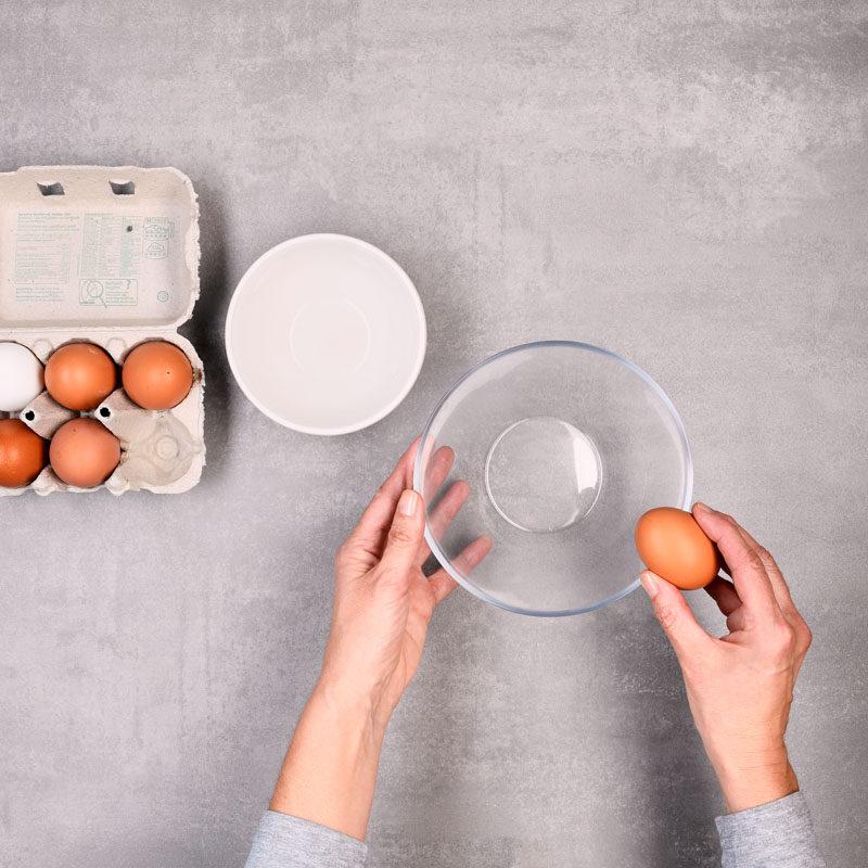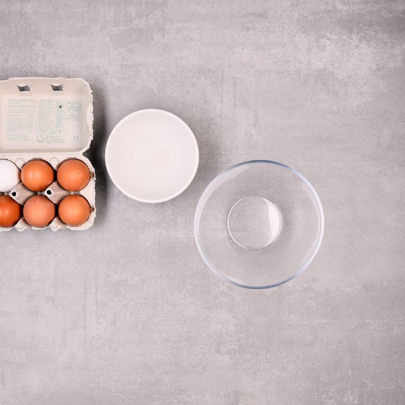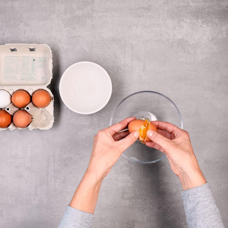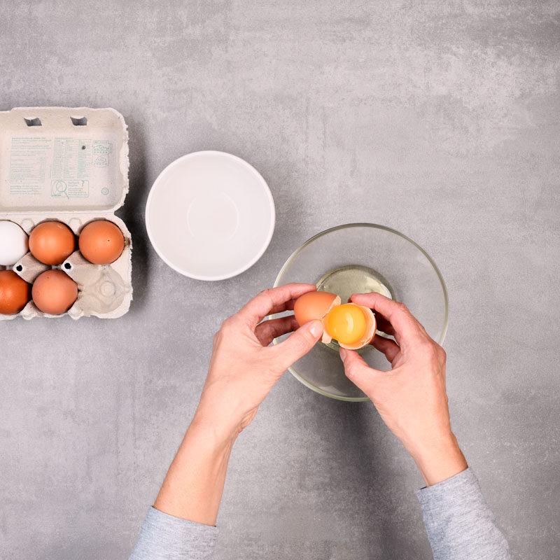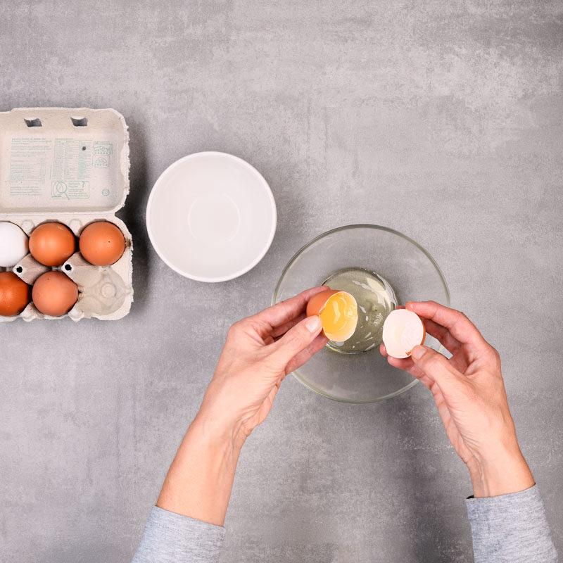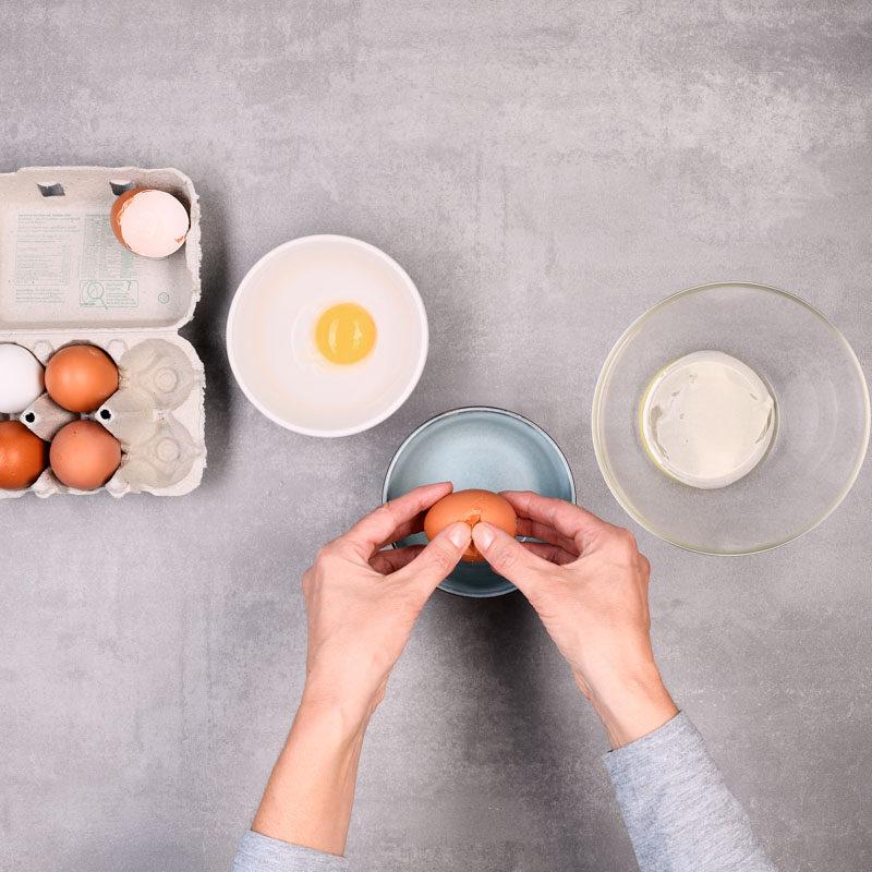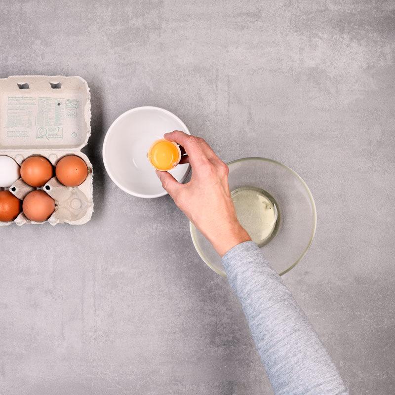Ein Ei in seine Bestandteile Eiweiss und Eigelb zu trennen ist keine Hexerei, braucht aber etwas Übung. Wichtig bei diesem Arbeitsschritt ist es, dass sich möglichst kein Eigelb mit dem Eiweiss vermischt – sonst besteht die Gefahr, dass du das Eiweiss nicht mehr zu Eischnee rühren kannst.