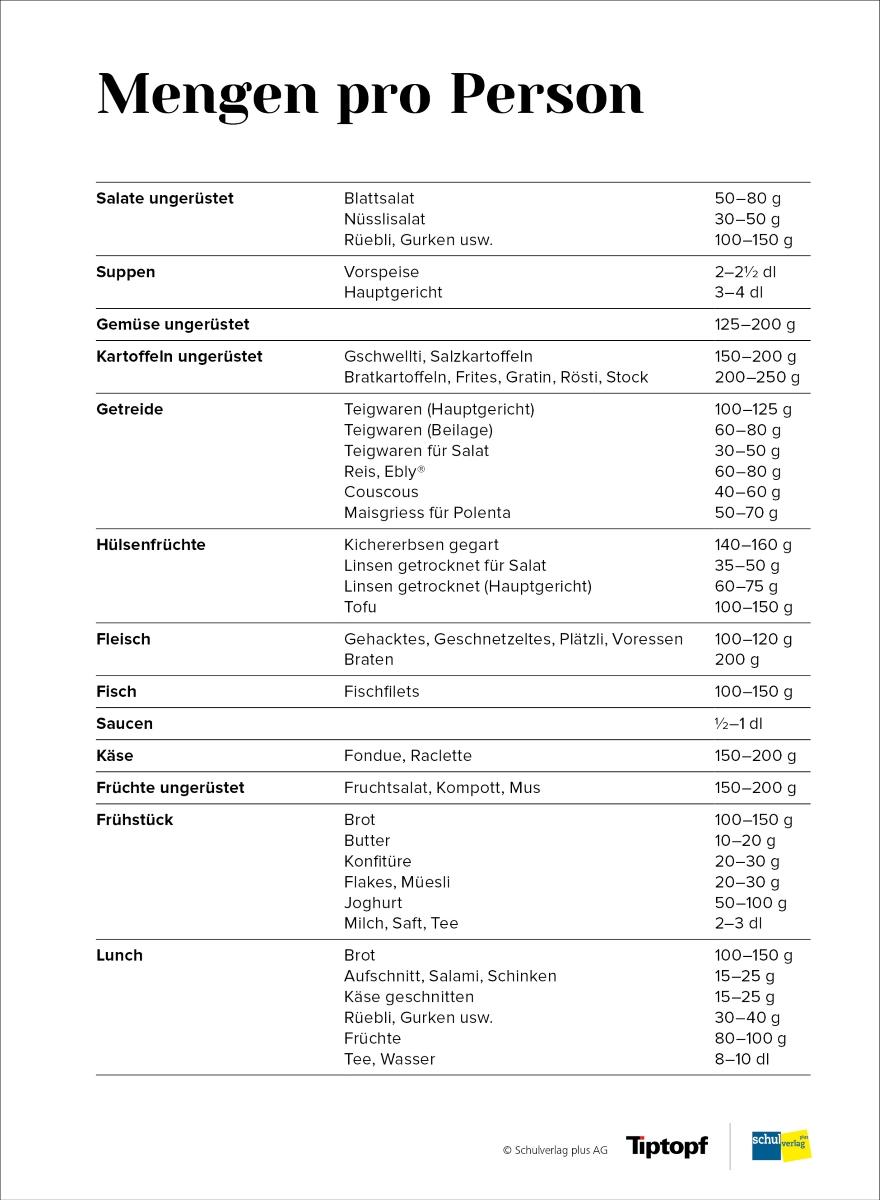 Deshalb sind die «Mengen pro Person» als Bereiche «von – bis» angegeben. Die Angaben sind als Richtwerte zu verstehen.